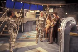 Tom as the Doctor with Alan Lake, James Maxwell, and Louise Jameson in Underworld. Picture © BBC